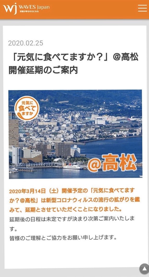 開催延期のお知らせ WAVES Japan inイオンモール高松 2020.02.28 延期とさせていただくことになりました。 延期後の日程は決まり次第ご案内いたします。 Category:新着情報 Author:Qちゃん 管理者 /blog/blog_comments/captcha/54128268 /blog/blog_comments/get_token